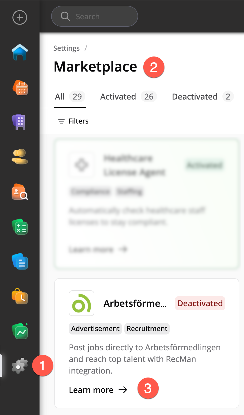 För att aktivera Arbetsförmedlingen-integrationen, gå till Systeminställningar och välj Marketplace.