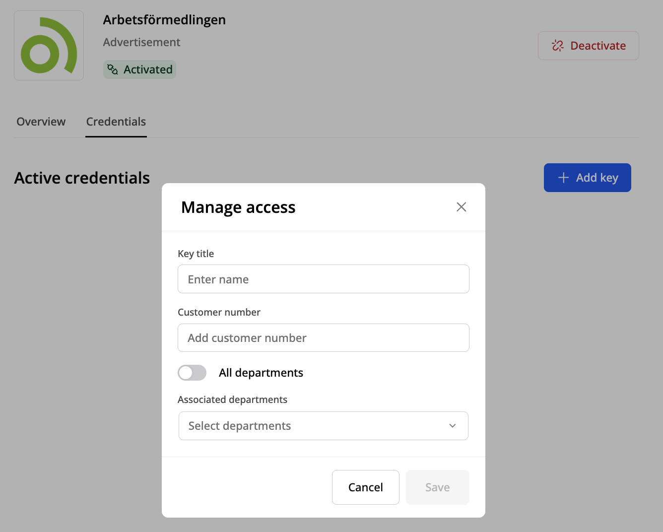 Klicka på den blå aktiveringsknappen för att börja använda Arbetsförmedlingen-integrationen.